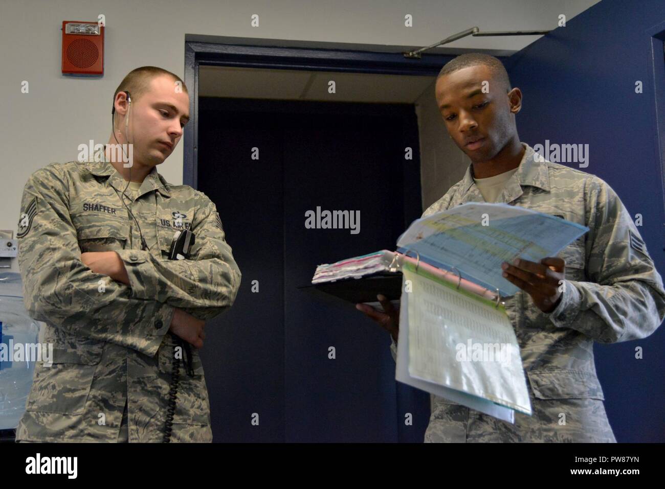 From Left U S Air Force Staff Sgt Joshua Shaffer 1st Operations Support Squadron Tower Watch Supervisor And Senior Airman Richard Smith 1st Oss Air Traffic Controller Brief Their Crew Before Starting The